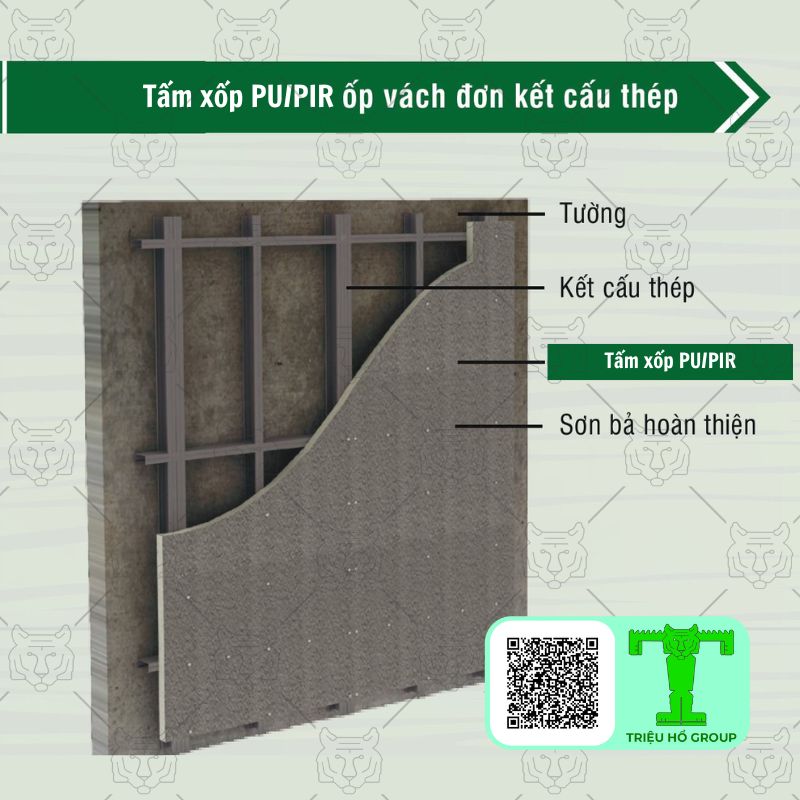 Phương pháp này thường được sử dụng cho các loại tường đã xây sẵn hoặc có kết cấu nhẹ, trong đó tấm PU/PIR được lắp đặt bên trong để tạo thành lớp cách nhiệt và cách âm chủ đạo. Thay vì phải xây dựng thêm lớp tường mới, lớp sơn bả hoàn thiện được áp dụng trực tiếp trên bề mặt tấm PU/PIR, giúp tiết kiệm diện tích và chi phí. Ngoài ra, tính năng siêu nhẹ của tấm PU/PIR còn góp phần giảm trọng lượng cho kết cấu tường, từ đó tối ưu hóa cấu trúc tổng thể.